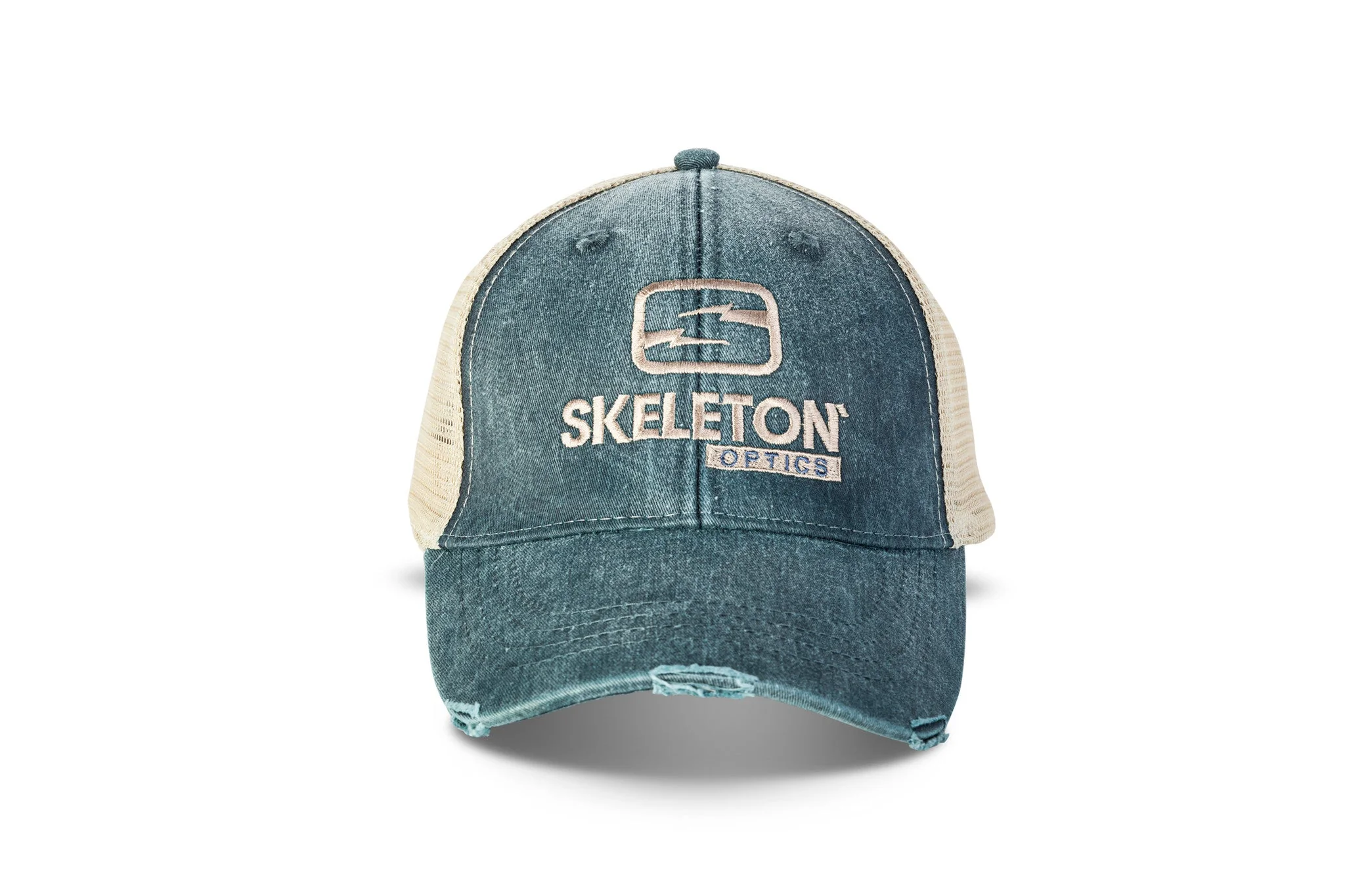 Made of 100% cotton, garment-washed and pigment-dyed on front two panels and visor, 100% nylon mesh on tan back panels, structured, mid-profile, 6-panel, updated trucker style, distressed torn visor, cotton twill sweatband and matching plastic back tab closure.